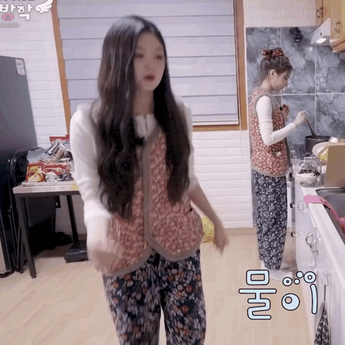 Hayeon dances energetically in a kitchen while Joobin cooks in the background, both wearing floral vests.