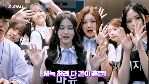 K-pop group tripleS members, including Joobin and Mayu, wave goodbye from an elevator, heading to a pre-recording.