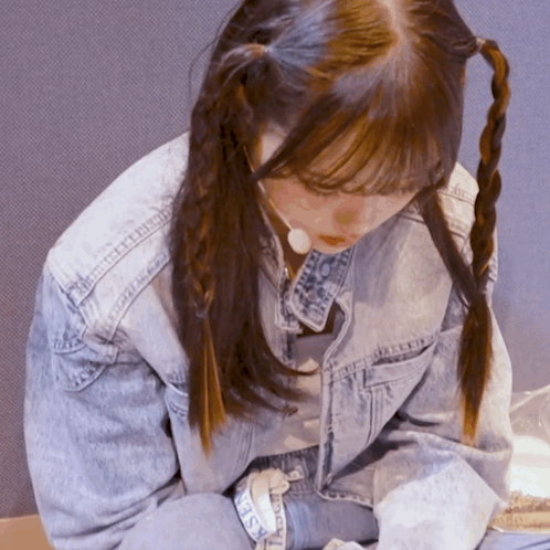 Kpop Triples member Seoah with braided pigtails, wearing a denim jacket and looking down.