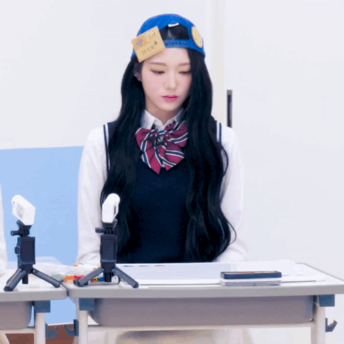 Kpop idol Xinyu sits at a school desk in uniform, looking thoughtful with math equations.