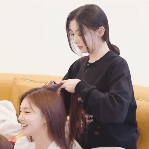 Kpop idol Kaede braids Yeonji's hair while they relax on a couch, sharing a fun and sweet moment.
