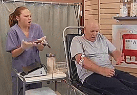 A nurse and patient react dramatically during a blood procedure, then smile, revealing a prank.