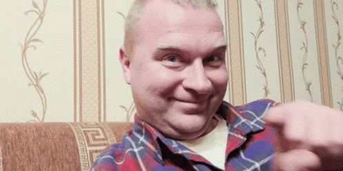 Man in plaid shirt points and gives a thumbs up with a smirk.