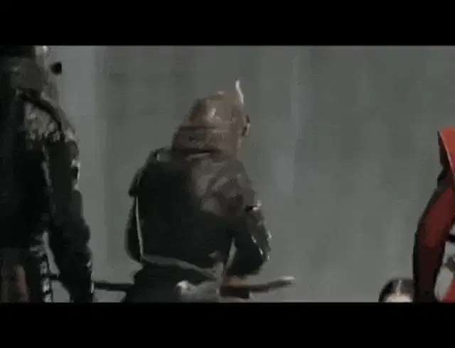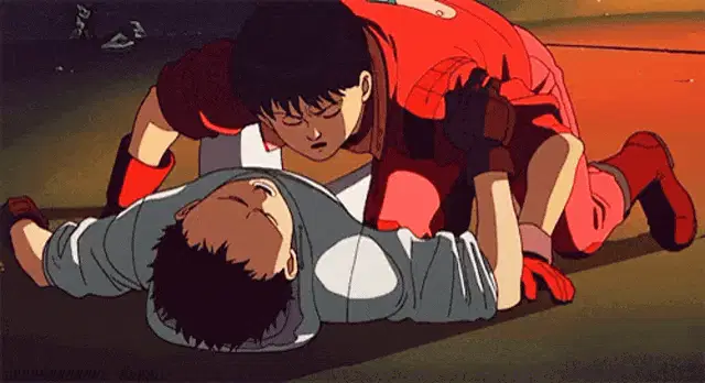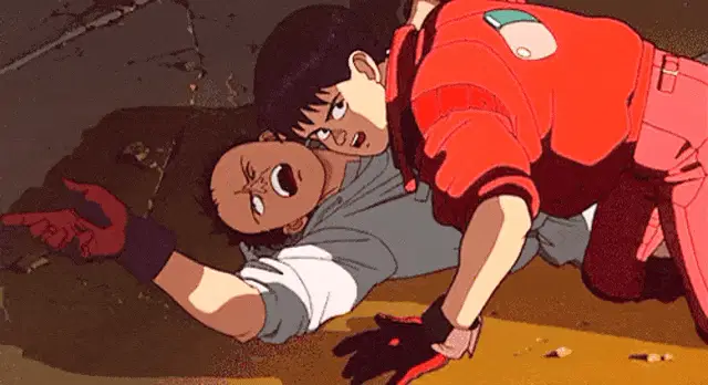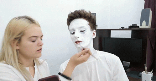 Akira gets white face makeup and bright red lipstick applied by a woman.
