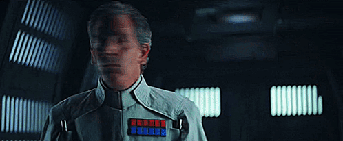 a man in a star wars uniform is standing in a dark room with a blurred face .