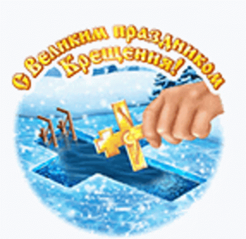 A hand places a golden cross into an ice-hole shaped like a cross, celebrating the Great Feast of Epiphany.