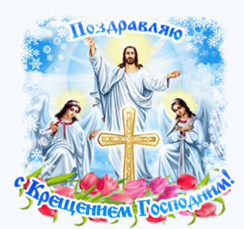 Jesus with two angels, a golden cross, and flowers, with a Russian greeting for the Baptism of the Lord.