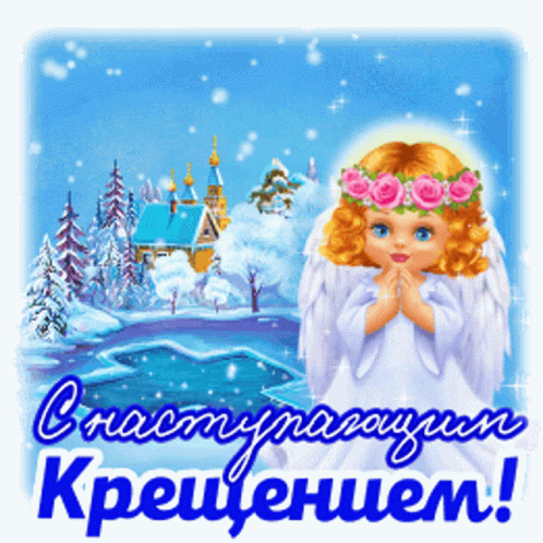 An angel with a rose wreath wishes 'Happy upcoming Epiphany! Peace and goodness!' in a snowy village scene.