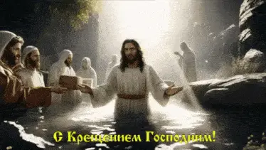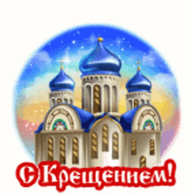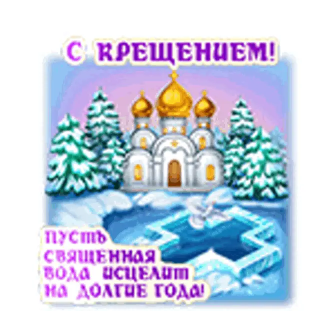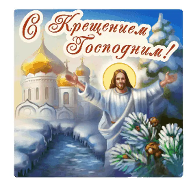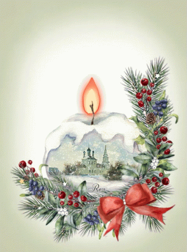 A festive greeting card for Epiphany, featuring a candle, winter scene with a church, and holiday decorations.