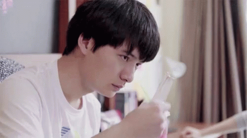 Krist Perawat from Peraya is seen eating or drinking from a pink cup, looking focused or slightly annoyed.