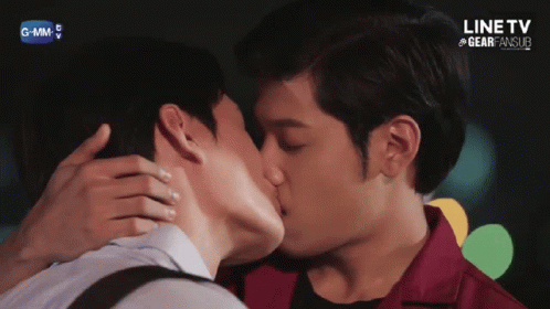 Krist Perawat and Singto Prachaya share a passionate kiss, with GMMTV and LINE TV logos visible.