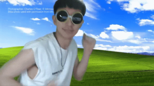 Krustingkevin, also known as Jinnytty's Brother, poses in round sunglasses against the iconic Windows XP Bliss background.