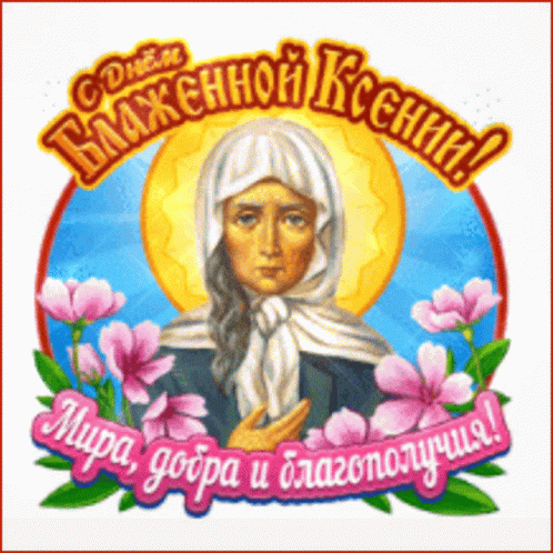 A religious greeting for the Day of Blessed Xenia, featuring an icon-like image of Saint Xenia with flowers.