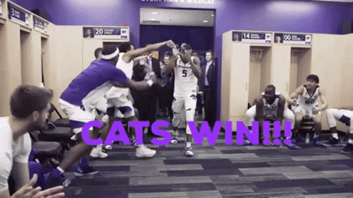 Kansas State Basketball players celebrate a 'Cats Win' in the locker room, spraying water and cheering.