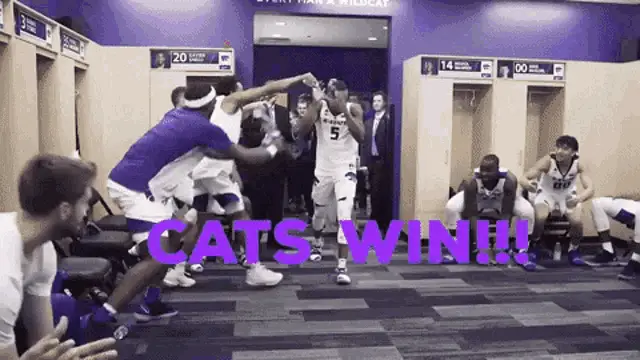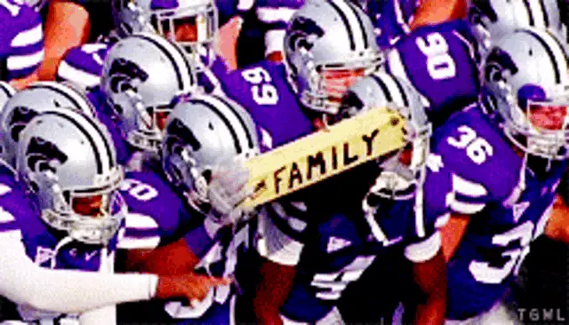 Kansas State football players in purple uniforms stand on the field, ready for action.