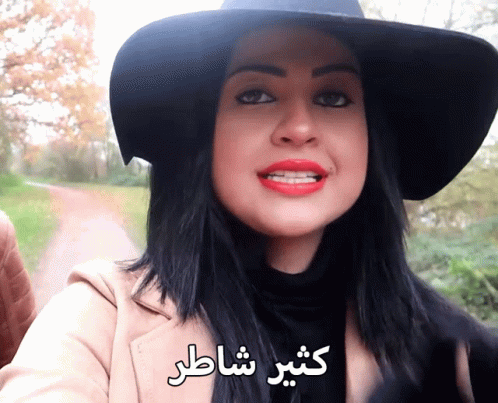 Woman in black hat and tan coat, with Arabic text 'Very clever' on screen, speaking outdoors.