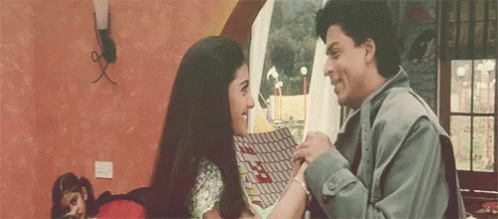 Shah Rukh Khan shares a romantic, flirty moment with his co-star, holding hands in Kuch Kuch Hota Hai.