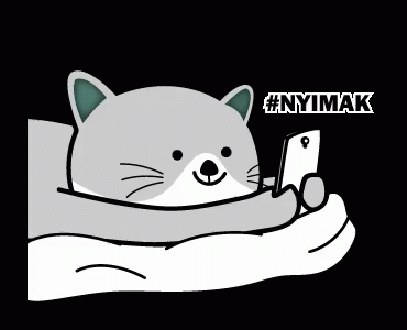 A cute grey cartoon cat lies down, engrossed in its phone, with the hashtag #NYIMAK appearing.
