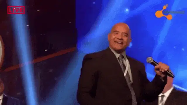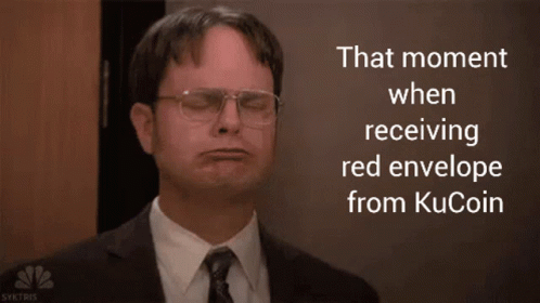 Dwight Schrute celebrates receiving a red envelope from KuCoin with an ecstatic reaction.