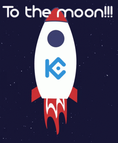 Kucoin rocket launching to the moon, featuring the Kucoin logo and 'To the moon!!!' text.
