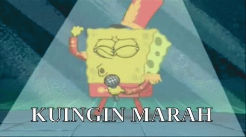 Spongebob Squarepants in a marching band uniform, passionately singing 'Kuingin Marah' into a microphone.
