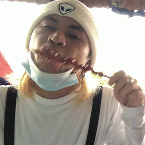 Mikoy Uy enjoying a skewer of Isaw BBQ, wearing a beanie with an alien design.