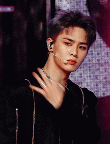 Kun WayV on stage, wearing a black jacket and ear microphone, striking a pose with rings on his fingers.