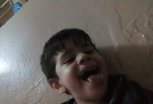 A Kurdish boy laughs joyfully while sticking his tongue out, captured in a close-up shot.