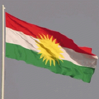The vibrant Kurdish flag, also known as Ala Rengîn, with its red, white, green stripes and golden sun, waves proudly.