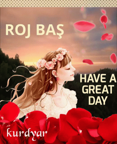 Kurdyar's 'Good Morning' greeting with a girl in a flower crown, surrounded by red roses, wishing 'Have a Great Day'.