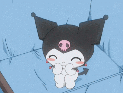 Kuromi, the mischievous Sanrio character, looks adorable and happy while sitting on a soft blue surface.