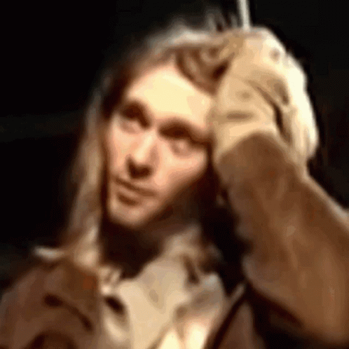 Kurt Cobain, the iconic frontman of Nirvana, looking thoughtful with his signature long blonde hair.