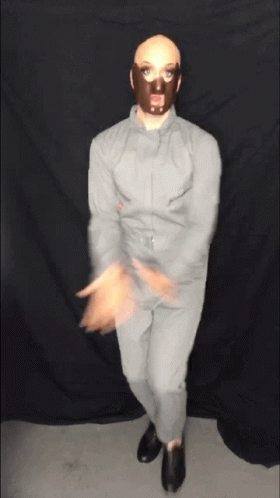 Kurt Fowl, dressed as Hannibal Lector in a grey jumpsuit and mask, performs a dance with expressive arm movements.