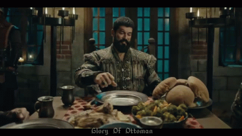 Osman Gazi, also known as Osman Bey, enjoys a meal at a table in a historical setting.