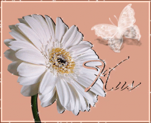 A beautiful white Kus flower with a butterfly, enhanced with sparkling effects and the word 'Kuss'.