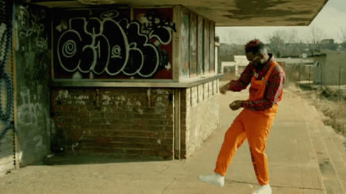 South African rapper Kwesta dances energetically in orange overalls in a vibrant township setting.