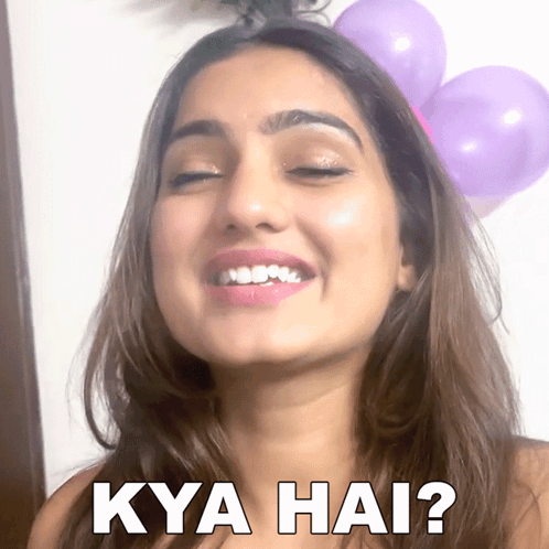 Varsha smiles and asks 'Kya Hai?' with purple balloons in the background, looking cheerful.