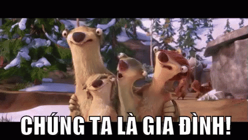Sid and his Ice Age family happily together, standing in the snow with the caption 'WE ARE FAMILY!'