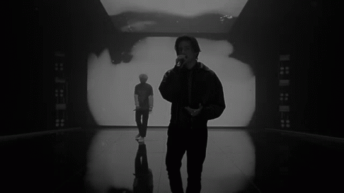James Reid performs on stage, singing 'baby, come closer to me' in a dramatic black and white setting.