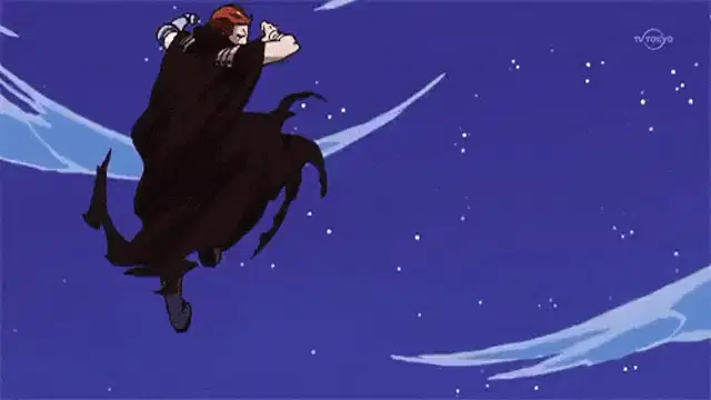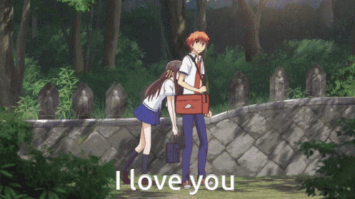 Tohru Honda leans on Kyo Sohma and confesses her love, causing Kyo to blush and react shyly.