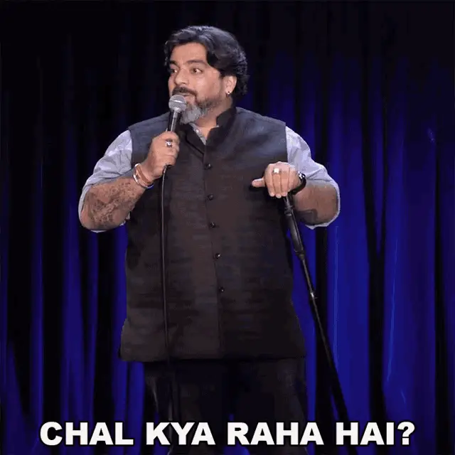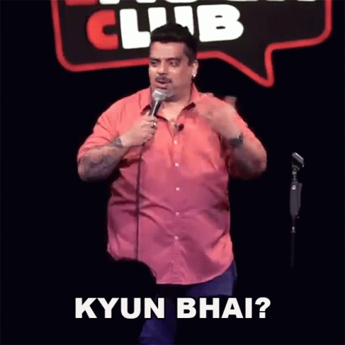 Jeeveshu Ahluwalia performs stand-up comedy, asking 'Kyun Bhai?' on stage at a comedy club.