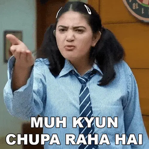 Pragati from The Mridul sits, looking confused with 'KYUN?' displayed on screen.