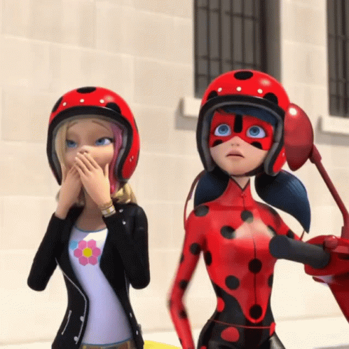 Ladybug and Zoe Lee, wearing their signature helmets, react with shock and surprise in a scene from Miraculous.