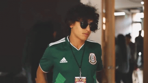Young man in sunglasses proudly shows off his green Mexico Adidas jersey, referencing 'La Camiseta Taburete'.