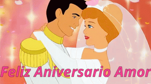 Cinderella and Prince Charming share a loving kiss, celebrating their anniversary with a heartfelt message.