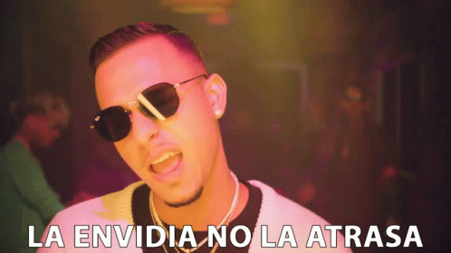 Dimelo Flow and Lyanno in a music video, a man in sunglasses speaks with 'La Envidia No La Atrasa' text.