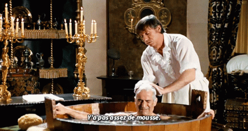 Louis De Funes in La Folie Des Grandeurs, getting his head washed in a wooden tub, with a funny caption.