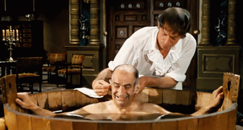 Louis De Funes, as Don Salluste, endures a comical ear cleaning by Yves Montand in a wooden tub.