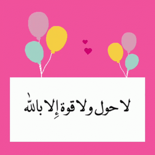 A vibrant pink background adorned with colorful balloons and hearts, featuring the Arabic phrase 'لا حول ولا قوة إلا بالله'.