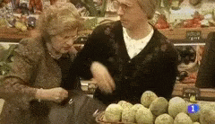 Vieja El Visillo from La Hora De Jose Mota in a grocery store, talking on the phone.
